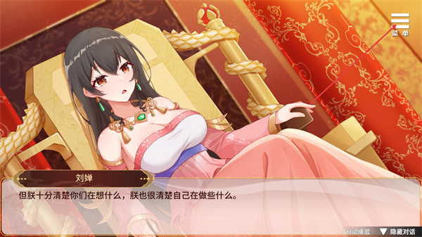 3、观看角色对话剧情,显示刘禅的台词内容,可通过点击对话框推进对话,点击右上角的菜单按钮可以进入设置页面。