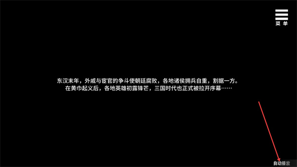 2、进入游戏后播放背景剧情,展示了东汉末年的背景内容,点击界面的自动播放,可自动推进这段背景剧情的展示。