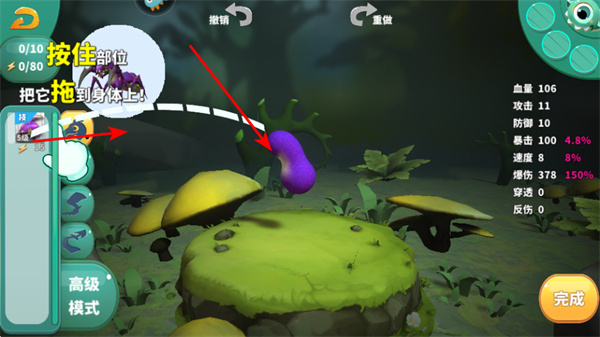 2、拖动部件到生物身体上,可组装生物的身体结构,这是塑造生物能力的核心操作,拖动时需根据部件的属性和生物的需求进行搭配。