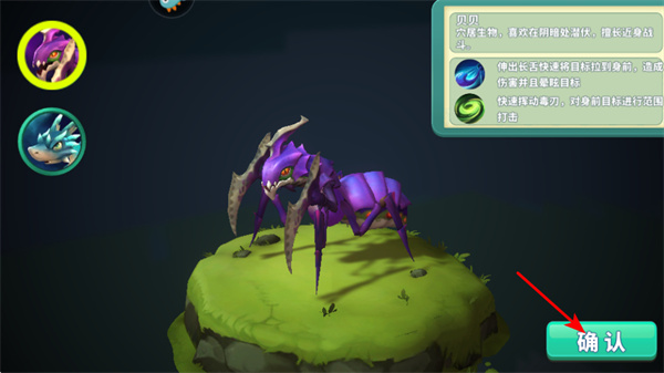 1、游戏中点击确认按钮,可选择并确定使用的生物如紫色蚂蚁贝贝,开启生物养成与战斗的关键操作,点击后将进入生物组装环节。
