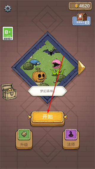 1、在主界面选择梦幻森林关卡,点击开始,进入石窟地牢冒险。