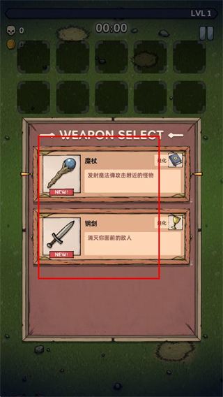 武器选择界面提供不同类型的战斗装备如范围攻击的魔杖、单体输出的钢剑,且武器效果随机适配关卡怪物,每一局冒险的武器组合都可能不同,让探索充满策略性。