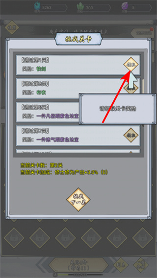 2、在挑战关卡界面,点击领取按钮可获取已通关关卡的对应奖励如铁剑、布衣,解锁这些奖励能提升修士的装备水平,强化战斗能力。