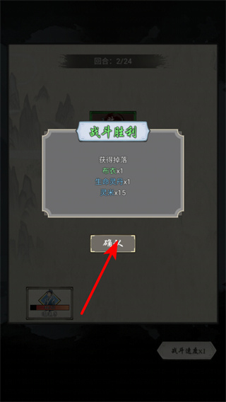 1、战斗胜利后,点击确认按钮可领取本次战斗的掉落奖励如布衣、生命灵丹,这是积累修仙资源的基础操作,助力后续修士养成与宗门发展。