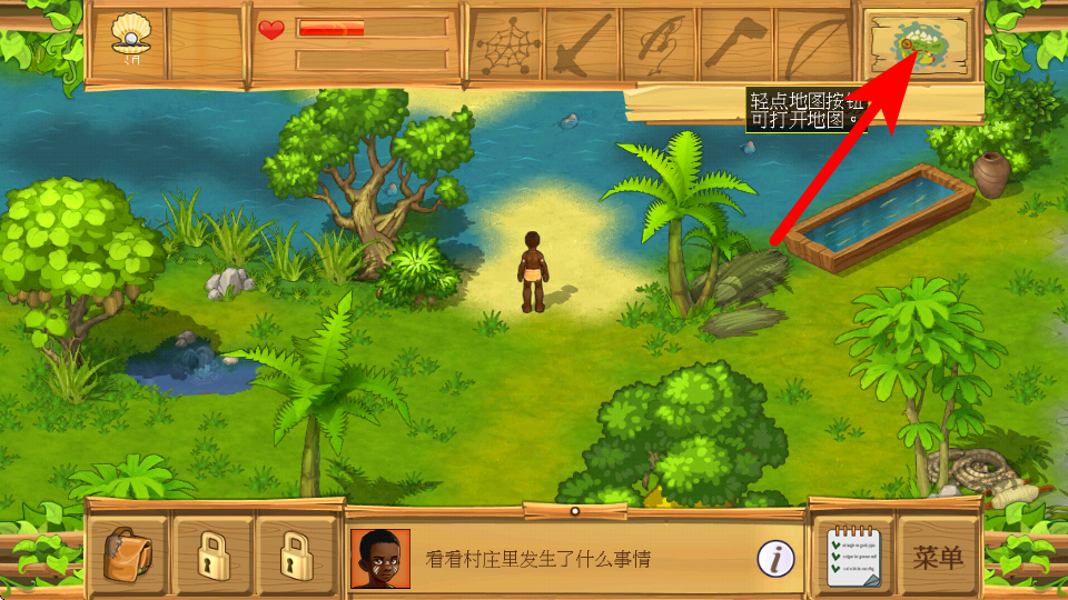 1、进入场景后,点击箭头指引的地图按钮,打开地图界面,这是查看区域布局的关键操作,准确点击才能获取地图信息。