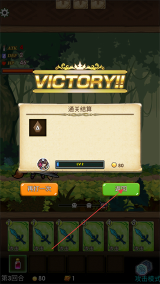 4、通关结算界面可以领取经验值和金币奖励,点击返回按钮回到关卡选择界面。
