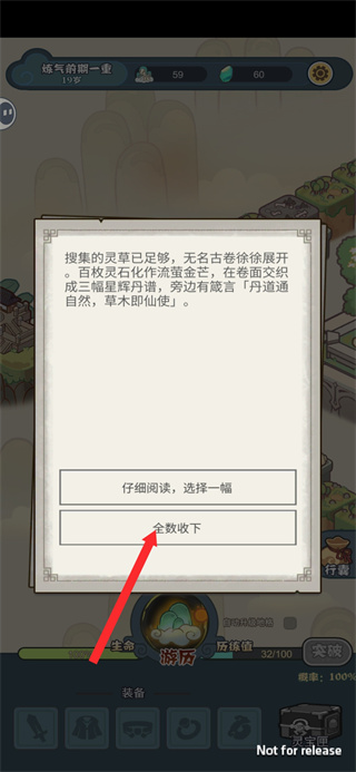 3、当灵草收集足够触发丹谱提示时,点击全数收下按钮,这是获取丹道资源的核心操作,收下后可解锁丹谱内容,助力后续炼丹修行推进。