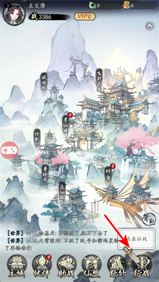 3、在主界面点击红色箭头指向的征战按钮,可进入战斗关卡,推进主线剧情获取修行资源。