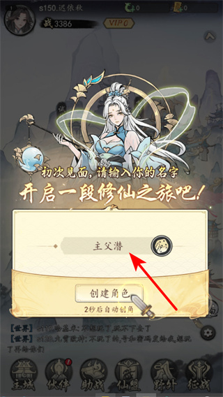 2、在角色创建界面,点击红色箭头指向的输入框,可修改角色名字,点击创建角色开启修仙。