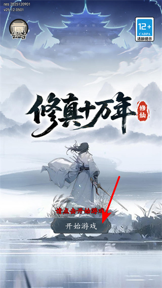 1、在游戏启动界面,点击红色箭头指向的开始游戏按钮,即可进入修真十万年的修仙流程。