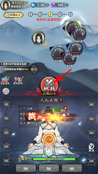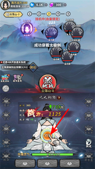 1、完成关卡挑战后,点击突破按钮可提升角色境界如凡人阶,同时大幅增加战力数值,为后续关卡积累优势。