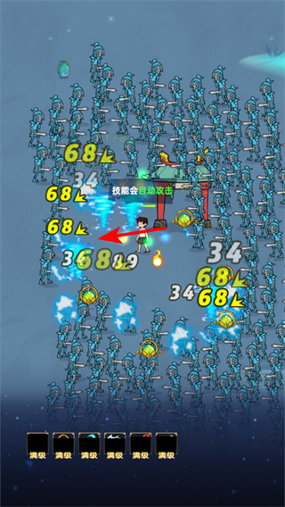 3、战斗时技能会自动攻击敌人,红色箭头指向的数值为攻击伤害,无需手动释放技能即可自动清敌。