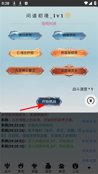 1、点击红色箭头指向的问道初境Lv1秘境入口,可进入对应副本挑战,这是开启秘境冒险的关键操作。
