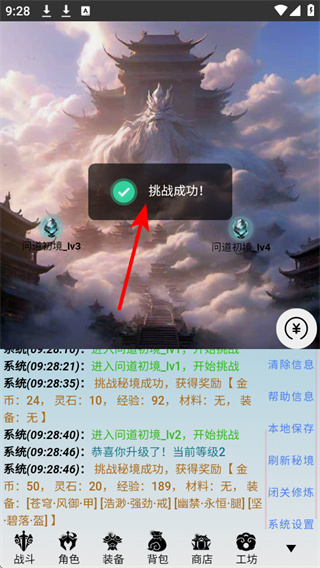 3、挑战成功后,点击红色箭头指向的按钮确认奖励,可领取副本掉落的金币、灵石等资源,积累成长材料重要操作。