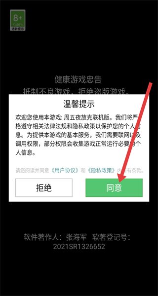 1、在温馨提示弹窗中,点击同意按钮,接受《用户协议》和《隐私政策》,进入游戏。