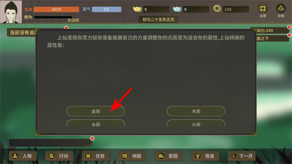 1、在属性选择界面,根据自身修炼方向选金质水质等属性,不同属性会影响角色灵力发展后续能力,是重要开端。