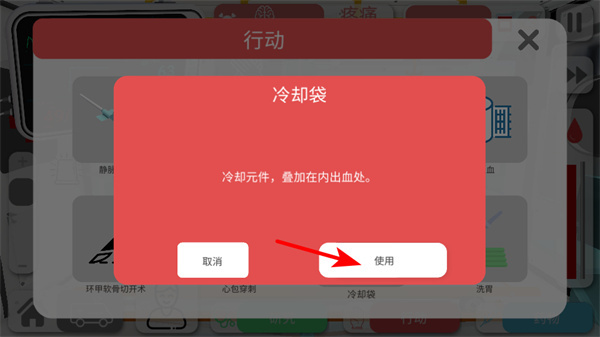 3、在行动界面,点击使用冷却袋可对病人内出血处进行处理,是应对内出血的重要医疗工具,正确使用。
