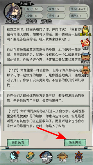 4、在剧情选择界面,点击红色箭头指向的低头思索按钮,选择该剧情选项,推进与慕容雪相关的剧情发展。