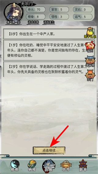 2、进入剧情界面后,点击红色箭头指向的点击继续按钮,推进角色的成长剧情,解锁后续的修炼、历练等玩法。