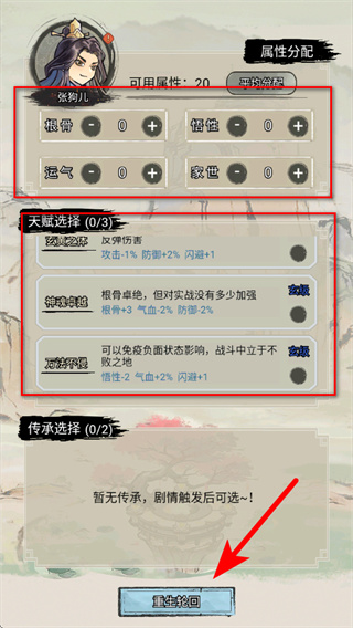 1、在角色创建界面完成属性、天赋配置后,点击红色箭头指向的重生轮回按钮,确认初始配置修仙剧情流程。