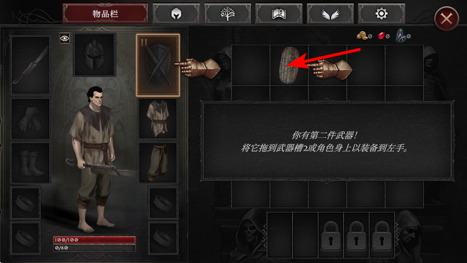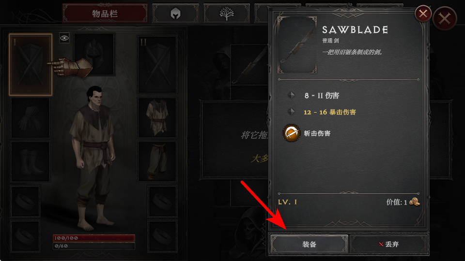 2、在物品栏中,将红色箭头指向的新武器,拖到武器槽或角色身上,即可将其装备到右手,伤害会基于该武器。