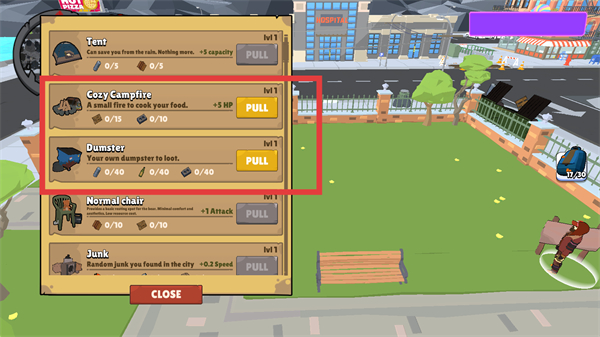 2、打开建造界面,优先收集Cozy Campfire和Dumster所需材料,点击对应PULL按钮解锁设。