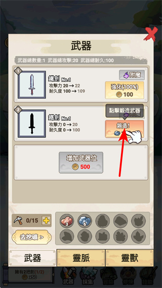 3、进入武器界面后,点锻造可消耗材料升级现有武器,升级后武器的属性如攻击、耐久会得到提升,进一步增强角色在战斗中的压制力。