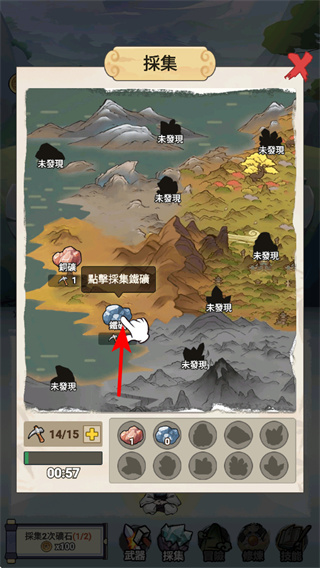 1、在采集界面,点击可采集的资源点如蓝色资源,消耗采集次数获取对应材料,材料是后续强化装备提升资源,为角色养成积累基础。