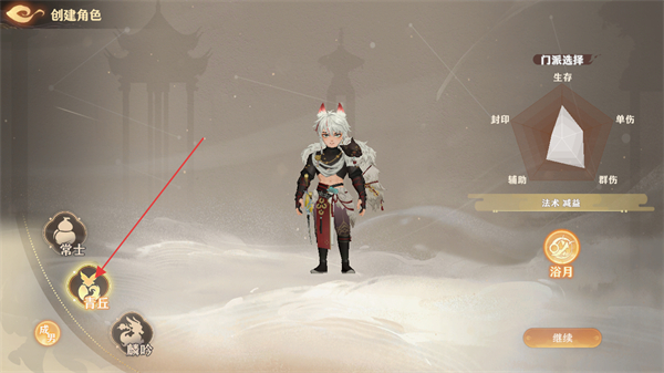 2、创建角色可以点击左下角选择游戏角色的门派,根据右侧给予的属性值进行挑选。