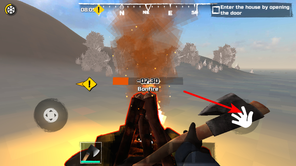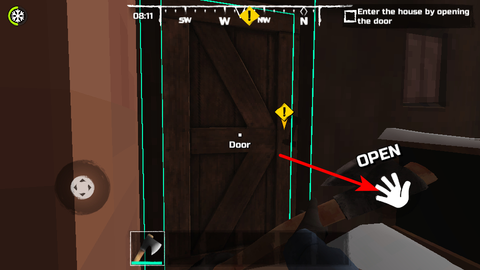 4、靠近房屋大门并点击OPEN按钮开门,进入房屋可获取更多资源或躲避危险,是探索和推进游戏进程的关键步骤。