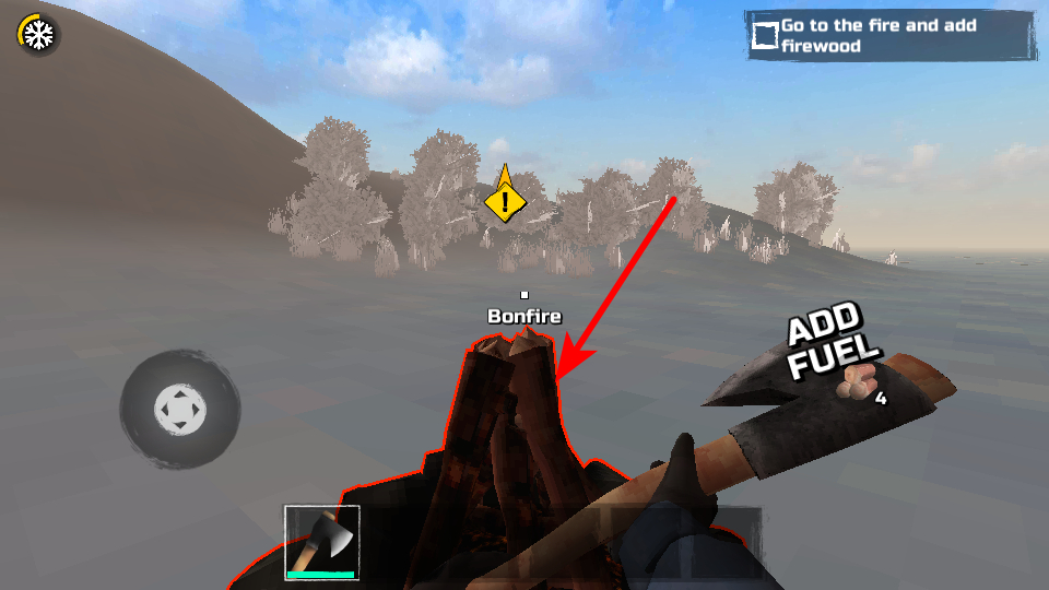 2、靠近篝火并添加木柴,篝火是维持生存、抵御寒冷的关键设施,添加木柴可延长篝火燃烧时间,保障自身生存环境。