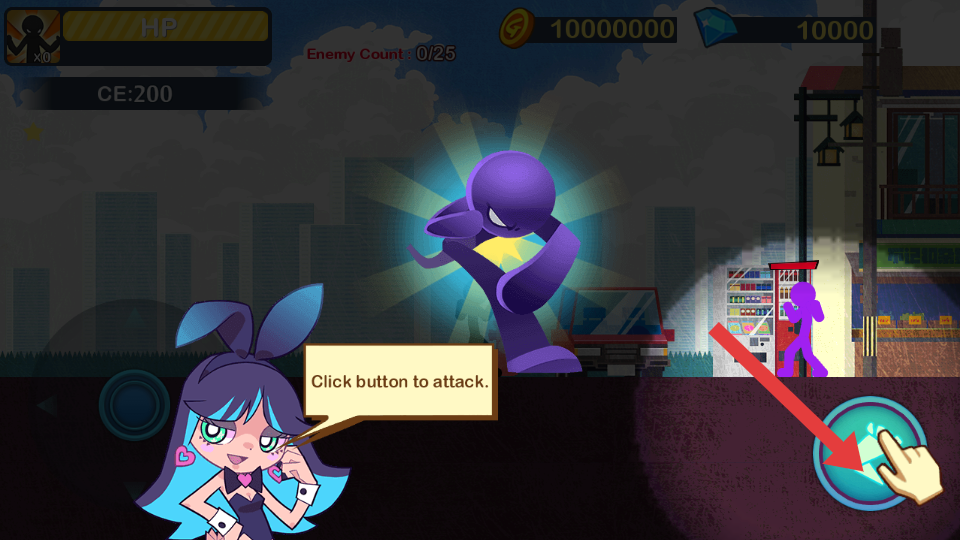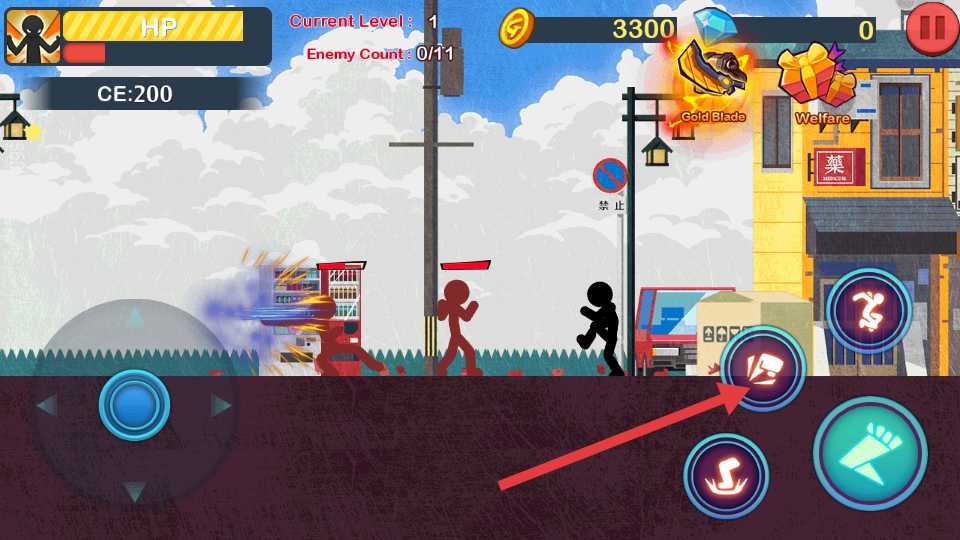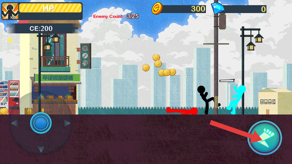 1、通过方向键控制火柴人移动,配合右下角攻击按键练习基础打击操作,初期优先攻击单个的敌人。