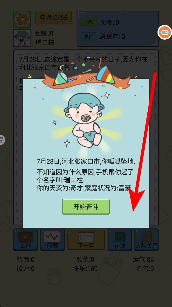1、新手玩家在初始界面找到开始游戏,点击后进入游戏,开启属于自己的中国式人生模拟,从出生等阶段逐步展开人生历程。