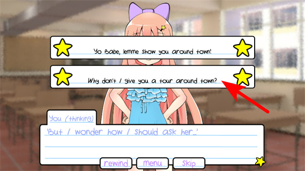 4、进入新的对话选择界面后,点击红色箭头指向Why don’t I give you a tour around town选项,选择该提议来推进与角色的互动,继续解锁后续的剧情内容。