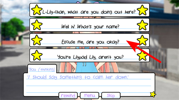 3、在对话选择界面中,点击红色箭头指向的Excuse me, are you okay选项,选择该对话内容来安抚哭泣的角色,推进剧情的发展,同时契合角色的心理提示。