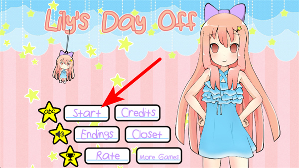 1、进入Lily's Day Off启动界面后,点击红色箭头指向的Start按钮,开启游戏的剧情冒险,这是进入游戏剧情的关键操作,准确点击才能加载剧情内容。