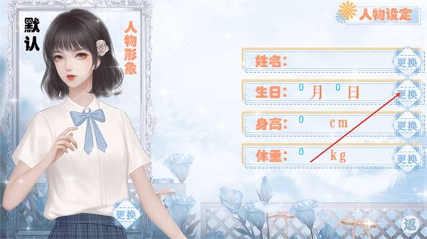 2、进入游戏的人物设定界面,可通过各选项旁的更换按钮,设置角色的姓名、生日、身高、体重等信息,完成角色的个性化设定。