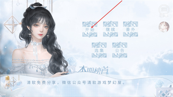 1、在该游戏的启动界面,界面包含开始、继续、番外等功能按钮,点击开始按钮即可进入游戏的初始流程,开启游戏的剧情体验。