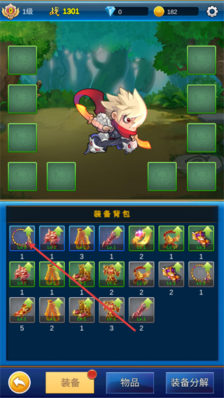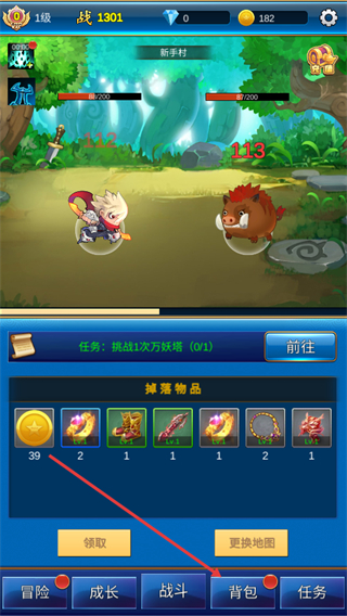 2、进入游戏主界面后,点击底部的背包选项,进入背包界面,查看已获取的装备道具。