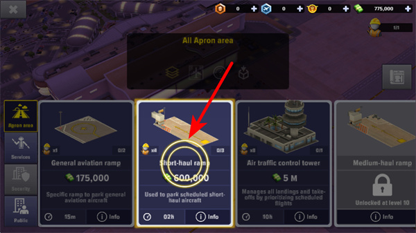 3、在设施选择界面中,点击红色箭头指向的设施,选择该设施进行建造,消耗资源拓展机场的停机坪功能,提升机场能力。