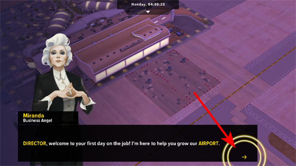 1、进入游戏引导界面后,点击红色箭头指向的箭头按钮,跳过初始引导,进入机场经营的主界面,经营玩法的关键操作。