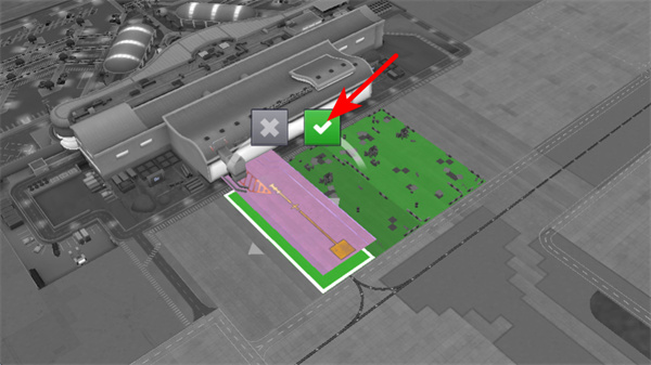 4、进入设施放置界面后,点击红色箭头指向的对勾按钮,确认设施的放置位置,完成的建造,推进机场的扩建流程。