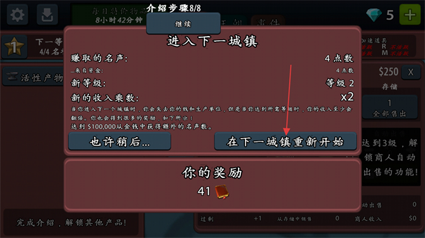 2、在升级界面中,完成当前介绍步骤后,点击在下一城镇重新开始按钮,虽会失去现有金钱与生产单元,但可获得等级提升、收入乘数翻倍等奖励。