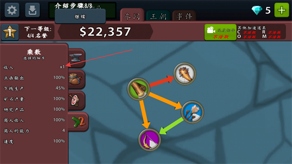3、在乘数界面中,查看左侧收入、点击输出等乘数的详情,同时继续推进木材到狼牙棒、箭、弓的生产链,借助乘数加成提升各环节的产出效率。