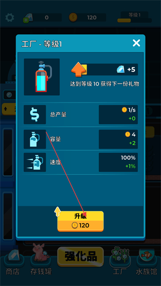 4、点击底部的工厂按钮,会打开工厂界面,此处可消耗120金币进行升级,升级后能提升总产量、容量等属性,助力资源获取效率的提升。