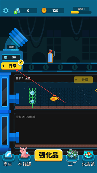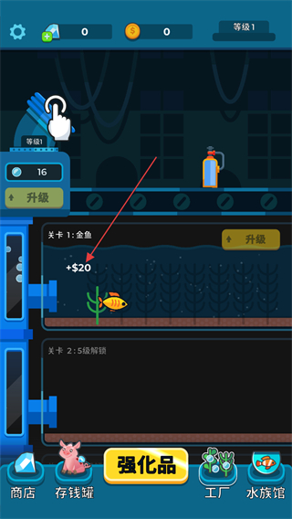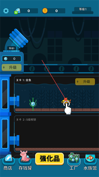 1、这是游戏的关卡1界面,当前处于等级1,点击关卡内的金鱼,可加快金鱼的生产效率,后续可通过积累资源进行升级操作。
