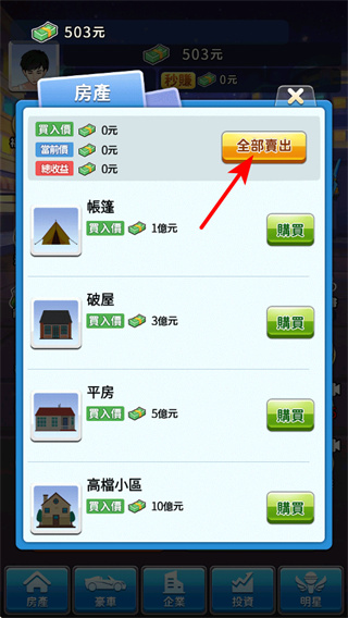 2、进入房产界面后,点击全部卖出可快速处理现有房产,点击购买获取新房产,房产能带来持续的被动收益。