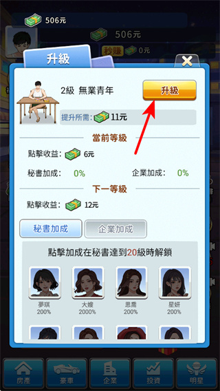 1、在升级界面点击升级按钮,消耗资金提升角色等级,等级越高点击收益越高,这是加快资金积累的核心操作。