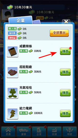 4、进入企业界面后,点击企业对应的购买按钮,解锁企业可获得长期的收益增长,解锁低门槛企业助力资源积累。