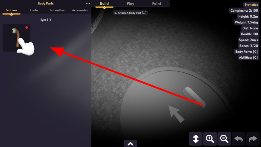 3、进入身体部位编辑菜单,找到眼睛选项,将其添加到生物身上,可改变生物的外观与视觉相关设定,让生物更具独特性。